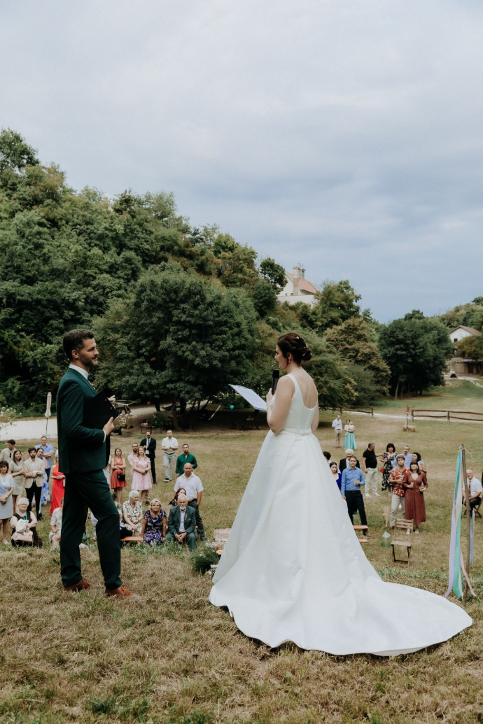 Nagyon tetszett és rendkívül fontosnak tartottuk azt a személyes hangvételt és stílust, amit képviselsz. Úgy gondoljuk, hogy sem egy egyházi sem egy hivatalos polgári szertartás nem tette volna lehetővé, hogy az esküvőn elhangzott beszéd annyira személyre szabott legyen, mint amilyet te tartottál. Így valóban úgy érezhettük, hogy az a fél óra rólunk szól, és a násznép reakcióiból arra következtetünk, hogy nekik is nagyon tetszett. Egyszerre volt megható és vicces, és nagyon passzolt hozzánk. Amit még kiemelnénk, az a téged jellemző megbízhatóság és pontosság, ami szintén nagyon fontos, bármilyen vállalkozásról legyen is szó.