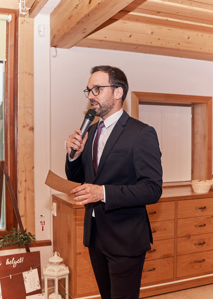 Ceremóniamesterként már az esküvő előtti utolsó héten átvett tőlünk terheket, tartotta a kapcsolatot a szolgáltatókkal, az esküvő alatt pedig minden problémát megoldott, az estét tökéletesen levezényelte, humoros volt és nagyon fesztelen hangulatot teremtett. Tudta, mikor húzódjon háttérbe, de mindig ott volt, ha szükség volt rá. Nagy szerepet játszott abban, hogy a nagy napunk olyan legyen, amilyennek megálmodtuk, így bármikor őt választanánk!